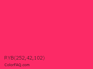 RYB 252,42,102 Color is a normal rose color and the nearest color is Radical Red #ff355e. Hex code #fc2a66 and RGB value is rgb(252,42,102). In RGB color space, this color is composed of 99% red, 16% green, 40% blue, In CMYK color space, this color is composed of 0% cyan, 83% magenta, 60% yellow , 1% black , In HSL color space, this color has a hue angle of 343° , 97% saturation and 58% lightness.