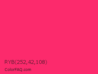 RYB 252,42,108 Color is a normal rose color and the nearest color is Radical Red #ff355e. Hex code #fc2a6c and RGB value is rgb(252,42,108). In RGB color space, this color is composed of 99% red, 16% green, 42% blue, In CMYK color space, this color is composed of 0% cyan, 83% magenta, 57% yellow , 1% black , In HSL color space, this color has a hue angle of 341° , 97% saturation and 58% lightness.