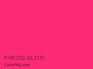 RYB 252,42,115 Color is a normal rose color and the nearest color is Radical Red #ff355e. Hex code #fc2a73 and RGB value is rgb(252,42,115). In RGB color space, this color is composed of 99% red, 16% green, 45% blue, In CMYK color space, this color is composed of 0% cyan, 83% magenta, 54% yellow , 1% black , In HSL color space, this color has a hue angle of 339° , 97% saturation and 58% lightness.