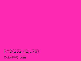 RYB 252,42,178 Color is a normal magenta color and the nearest color is Persian Rose #fe28a2. Hex code #fc2ab2 and RGB value is rgb(252,42,178). In RGB color space, this color is composed of 99% red, 16% green, 70% blue, In CMYK color space, this color is composed of 0% cyan, 83% magenta, 29% yellow , 1% black , In HSL color space, this color has a hue angle of 321° , 97% saturation and 58% lightness.