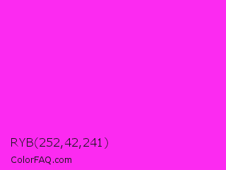 RYB 252,42,241 Color is a normal magenta color and the nearest color is Hot Magenta #ff1dce. Hex code #fc2af1 and RGB value is rgb(252,42,241). In RGB color space, this color is composed of 99% red, 16% green, 95% blue, In CMYK color space, this color is composed of 0% cyan, 83% magenta, 4% yellow , 1% black , In HSL color space, this color has a hue angle of 303° , 97% saturation and 58% lightness.
