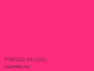 RYB 252,44,124 Color is a normal rose color and the nearest color is Cerise Pink #ec3b83. Hex code #fc2c7c and RGB value is rgb(252,44,124). In RGB color space, this color is composed of 99% red, 17% green, 49% blue, In CMYK color space, this color is composed of 0% cyan, 83% magenta, 51% yellow , 1% black , In HSL color space, this color has a hue angle of 337° , 97% saturation and 58% lightness.