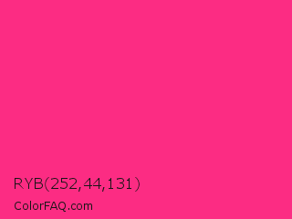 RYB 252,44,131 Color is a normal rose color and the nearest color is Cerise Pink #ec3b83. Hex code #fc2c83 and RGB value is rgb(252,44,131). In RGB color space, this color is composed of 99% red, 17% green, 51% blue, In CMYK color space, this color is composed of 0% cyan, 83% magenta, 48% yellow , 1% black , In HSL color space, this color has a hue angle of 335° , 97% saturation and 58% lightness.