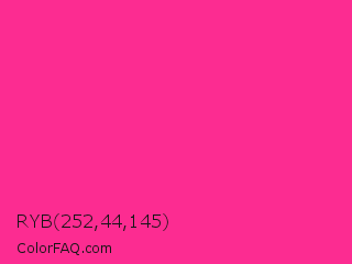 RYB 252,44,145 Color is a normal rose color and the nearest color is Wild Strawberry Crayola #ff3399. Hex code #fc2c91 and RGB value is rgb(252,44,145). In RGB color space, this color is composed of 99% red, 17% green, 57% blue, In CMYK color space, this color is composed of 0% cyan, 83% magenta, 42% yellow , 1% black , In HSL color space, this color has a hue angle of 331° , 97% saturation and 58% lightness.
