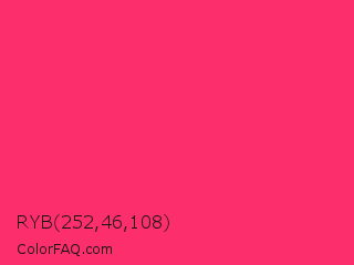 RYB 252,46,108 Color is a normal rose color and the nearest color is Radical Red #ff355e. Hex code #fc2e6c and RGB value is rgb(252,46,108). In RGB color space, this color is composed of 99% red, 18% green, 42% blue, In CMYK color space, this color is composed of 0% cyan, 82% magenta, 57% yellow , 1% black , In HSL color space, this color has a hue angle of 342° , 97% saturation and 58% lightness.