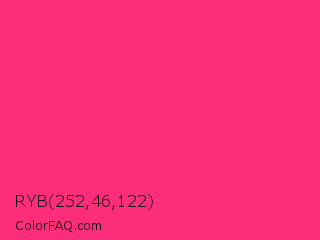 RYB 252,46,122 Color is a normal rose color and the nearest color is Cerise Pink #ec3b83. Hex code #fc2e7a and RGB value is rgb(252,46,122). In RGB color space, this color is composed of 99% red, 18% green, 48% blue, In CMYK color space, this color is composed of 0% cyan, 82% magenta, 52% yellow , 1% black , In HSL color space, this color has a hue angle of 338° , 97% saturation and 58% lightness.