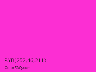 RYB 252,46,211 Color is a normal magenta color and the nearest color is Razzle Dazzle Rose #ff33cc. Hex code #fc2ed3 and RGB value is rgb(252,46,211). In RGB color space, this color is composed of 99% red, 18% green, 83% blue, In CMYK color space, this color is composed of 0% cyan, 82% magenta, 16% yellow , 1% black , In HSL color space, this color has a hue angle of 312° , 97% saturation and 58% lightness.