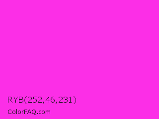 RYB 252,46,231 Color is a normal magenta color and the nearest color is Razzle Dazzle Rose #ff33cc. Hex code #fc2ee7 and RGB value is rgb(252,46,231). In RGB color space, this color is composed of 99% red, 18% green, 91% blue, In CMYK color space, this color is composed of 0% cyan, 82% magenta, 8% yellow , 1% black , In HSL color space, this color has a hue angle of 306° , 97% saturation and 58% lightness.