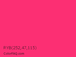 RYB 252,47,115 Color is a normal rose color and the nearest color is Radical Red #ff355e. Hex code #fc2f73 and RGB value is rgb(252,47,115). In RGB color space, this color is composed of 99% red, 18% green, 45% blue, In CMYK color space, this color is composed of 0% cyan, 81% magenta, 54% yellow , 1% black , In HSL color space, this color has a hue angle of 340° , 97% saturation and 59% lightness.