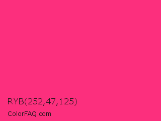 RYB 252,47,125 Color is a normal rose color and the nearest color is Cerise Pink #ec3b83. Hex code #fc2f7d and RGB value is rgb(252,47,125). In RGB color space, this color is composed of 99% red, 18% green, 49% blue, In CMYK color space, this color is composed of 0% cyan, 81% magenta, 50% yellow , 1% black , In HSL color space, this color has a hue angle of 337° , 97% saturation and 59% lightness.