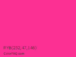 RYB 252,47,146 Color is a normal rose color and the nearest color is Wild Strawberry Crayola #ff3399. Hex code #fc2f92 and RGB value is rgb(252,47,146). In RGB color space, this color is composed of 99% red, 18% green, 57% blue, In CMYK color space, this color is composed of 0% cyan, 81% magenta, 42% yellow , 1% black , In HSL color space, this color has a hue angle of 331° , 97% saturation and 59% lightness.