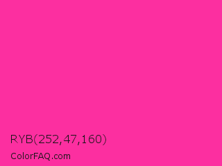 RYB 252,47,160 Color is a normal magenta color and the nearest color is Persian Rose #fe28a2. Hex code #fc2fa0 and RGB value is rgb(252,47,160). In RGB color space, this color is composed of 99% red, 18% green, 63% blue, In CMYK color space, this color is composed of 0% cyan, 81% magenta, 37% yellow , 1% black , In HSL color space, this color has a hue angle of 327° , 97% saturation and 59% lightness.