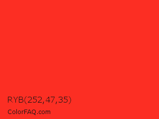 RYB 252,47,35 Color is a normal red color and the nearest color is Red RYB #fe2712. Hex code #fc2e23 and RGB value is rgb(252,46,35). In RGB color space, this color is composed of 99% red, 18% green, 14% blue, In CMYK color space, this color is composed of 0% cyan, 82% magenta, 86% yellow , 1% black , In HSL color space, this color has a hue angle of 3° , 97% saturation and 56% lightness.