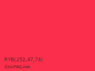 RYB 252,47,74 Color is a normal red color and the nearest color is Red Salsa #fd3a4a. Hex code #fc2f4a and RGB value is rgb(252,47,74). In RGB color space, this color is composed of 99% red, 18% green, 29% blue, In CMYK color space, this color is composed of 0% cyan, 81% magenta, 71% yellow , 1% black , In HSL color space, this color has a hue angle of 352° , 97% saturation and 59% lightness.