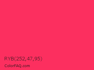 RYB 252,47,95 Color is a normal red color and the nearest color is Radical Red #ff355e. Hex code #fc2f5f and RGB value is rgb(252,47,95). In RGB color space, this color is composed of 99% red, 18% green, 37% blue, In CMYK color space, this color is composed of 0% cyan, 81% magenta, 62% yellow , 1% black , In HSL color space, this color has a hue angle of 346° , 97% saturation and 59% lightness.