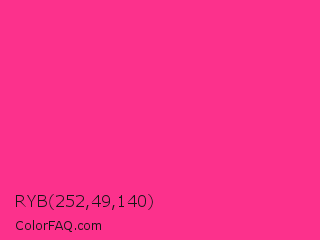 RYB 252,49,140 Color is a normal rose color and the nearest color is Wild Strawberry Crayola #ff3399. Hex code #fc318c and RGB value is rgb(252,49,140). In RGB color space, this color is composed of 99% red, 19% green, 55% blue, In CMYK color space, this color is composed of 0% cyan, 81% magenta, 44% yellow , 1% black , In HSL color space, this color has a hue angle of 333° , 97% saturation and 59% lightness.
