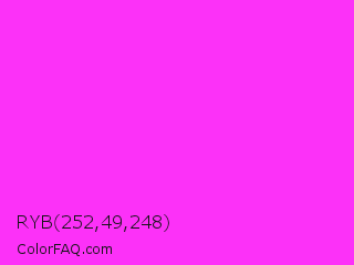 RYB 252,49,248 Color is a normal magenta color and the nearest color is Purple Pizzazz #fe4eda. Hex code #fc31f8 and RGB value is rgb(252,49,248). In RGB color space, this color is composed of 99% red, 19% green, 97% blue, In CMYK color space, this color is composed of 0% cyan, 81% magenta, 2% yellow , 1% black , In HSL color space, this color has a hue angle of 301° , 97% saturation and 59% lightness.