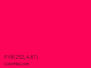 RYB 252,4,87 Color is a normal rose color and the nearest color is Folly #ff004f. Hex code #fc0457 and RGB value is rgb(252,4,87). In RGB color space, this color is composed of 99% red, 2% green, 34% blue, In CMYK color space, this color is composed of 0% cyan, 98% magenta, 65% yellow , 1% black , In HSL color space, this color has a hue angle of 340° , 98% saturation and 50% lightness.