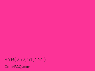 RYB 252,51,151 Color is a normal rose color and the nearest color is Wild Strawberry Crayola #ff3399. Hex code #fc3397 and RGB value is rgb(252,51,151). In RGB color space, this color is composed of 99% red, 20% green, 59% blue, In CMYK color space, this color is composed of 0% cyan, 80% magenta, 40% yellow , 1% black , In HSL color space, this color has a hue angle of 330° , 97% saturation and 59% lightness.
