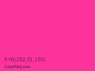RYB 252,51,155 Color is a normal rose color and the nearest color is Wild Strawberry Crayola #ff3399. Hex code #fc339b and RGB value is rgb(252,51,155). In RGB color space, this color is composed of 99% red, 20% green, 61% blue, In CMYK color space, this color is composed of 0% cyan, 80% magenta, 38% yellow , 1% black , In HSL color space, this color has a hue angle of 329° , 97% saturation and 59% lightness.