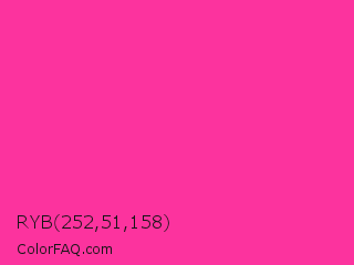 RYB 252,51,158 Color is a normal rose color and the nearest color is Wild Strawberry Crayola #ff3399. Hex code #fc339e and RGB value is rgb(252,51,158). In RGB color space, this color is composed of 99% red, 20% green, 62% blue, In CMYK color space, this color is composed of 0% cyan, 80% magenta, 37% yellow , 1% black , In HSL color space, this color has a hue angle of 328° , 97% saturation and 59% lightness.