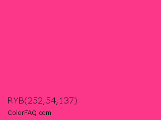 RYB 252,54,137 Color is a normal rose color and the nearest color is French Fuchsia #fd3f92. Hex code #fc3689 and RGB value is rgb(252,54,137). In RGB color space, this color is composed of 99% red, 21% green, 54% blue, In CMYK color space, this color is composed of 0% cyan, 79% magenta, 46% yellow , 1% black , In HSL color space, this color has a hue angle of 335° , 97% saturation and 60% lightness.