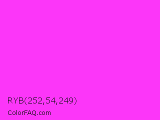 RYB 252,54,249 Color is a normal magenta color and the nearest color is Purple Pizzazz #fe4eda. Hex code #fc36f9 and RGB value is rgb(252,54,249). In RGB color space, this color is composed of 99% red, 21% green, 98% blue, In CMYK color space, this color is composed of 0% cyan, 79% magenta, 1% yellow , 1% black , In HSL color space, this color has a hue angle of 301° , 97% saturation and 60% lightness.