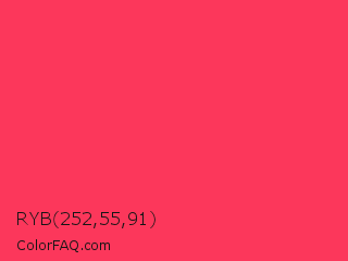 RYB 252,55,91 Color is a normal red color and the nearest color is Radical Red #ff355e. Hex code #fc375b and RGB value is rgb(252,55,91). In RGB color space, this color is composed of 99% red, 22% green, 36% blue, In CMYK color space, this color is composed of 0% cyan, 78% magenta, 64% yellow , 1% black , In HSL color space, this color has a hue angle of 349° , 97% saturation and 60% lightness.