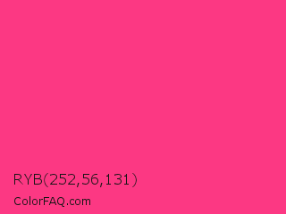 RYB 252,56,131 Color is a normal rose color and the nearest color is Sasquatch Socks #ff4681. Hex code #fc3883 and RGB value is rgb(252,56,131). In RGB color space, this color is composed of 99% red, 22% green, 51% blue, In CMYK color space, this color is composed of 0% cyan, 78% magenta, 48% yellow , 1% black , In HSL color space, this color has a hue angle of 337° , 97% saturation and 60% lightness.