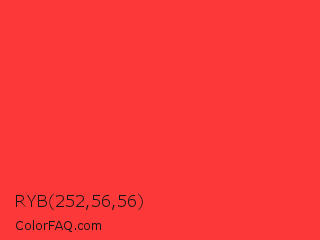RYB 252,56,56 Color is a normal red color and the nearest color is Red Orange #ff3f34. Hex code #fc3838 and RGB value is rgb(252,56,56). In RGB color space, this color is composed of 99% red, 22% green, 22% blue, In CMYK color space, this color is composed of 0% cyan, 78% magenta, 78% yellow , 1% black , In HSL color space, this color has a hue angle of 0° , 97% saturation and 60% lightness.