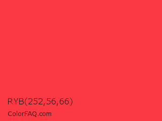 RYB 252,56,66 Color is a normal red color and the nearest color is Red Salsa #fd3a4a. Hex code #fc3842 and RGB value is rgb(252,56,66). In RGB color space, this color is composed of 99% red, 22% green, 26% blue, In CMYK color space, this color is composed of 0% cyan, 78% magenta, 74% yellow , 1% black , In HSL color space, this color has a hue angle of 357° , 97% saturation and 60% lightness.