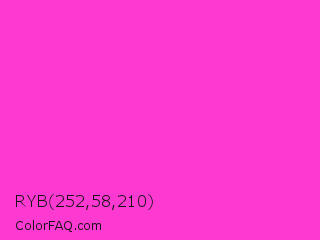 RYB 252,58,210 Color is a light magenta color and the nearest color is Razzle Dazzle Rose #ff33cc. Hex code #fc3ad2 and RGB value is rgb(252,58,210). In RGB color space, this color is composed of 99% red, 23% green, 82% blue, In CMYK color space, this color is composed of 0% cyan, 77% magenta, 17% yellow , 1% black , In HSL color space, this color has a hue angle of 313° , 97% saturation and 61% lightness.