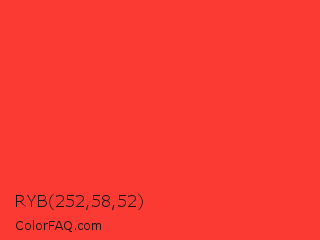 RYB 252,58,52 Color is a normal red color and the nearest color is Red Orange #ff3f34. Hex code #fc3a34 and RGB value is rgb(252,58,52). In RGB color space, this color is composed of 99% red, 23% green, 20% blue, In CMYK color space, this color is composed of 0% cyan, 77% magenta, 79% yellow , 1% black , In HSL color space, this color has a hue angle of 2° , 97% saturation and 60% lightness.