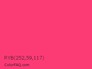 RYB 252,59,117 Color is a light rose color and the nearest color is Sasquatch Socks #ff4681. Hex code #fc3b75 and RGB value is rgb(252,59,117). In RGB color space, this color is composed of 99% red, 23% green, 46% blue, In CMYK color space, this color is composed of 0% cyan, 77% magenta, 54% yellow , 1% black , In HSL color space, this color has a hue angle of 342° , 97% saturation and 61% lightness.
