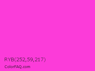 RYB 252,59,217 Color is a light magenta color and the nearest color is Razzle Dazzle Rose #ff33cc. Hex code #fc3bd9 and RGB value is rgb(252,59,217). In RGB color space, this color is composed of 99% red, 23% green, 85% blue, In CMYK color space, this color is composed of 0% cyan, 77% magenta, 14% yellow , 1% black , In HSL color space, this color has a hue angle of 311° , 97% saturation and 61% lightness.