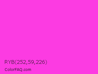 RYB 252,59,226 Color is a light magenta color and the nearest color is Purple Pizzazz #fe4eda. Hex code #fc3be2 and RGB value is rgb(252,59,226). In RGB color space, this color is composed of 99% red, 23% green, 89% blue, In CMYK color space, this color is composed of 0% cyan, 77% magenta, 10% yellow , 1% black , In HSL color space, this color has a hue angle of 308° , 97% saturation and 61% lightness.