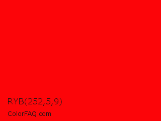RYB 252,5,9 Color is a normal red color and the nearest color is Candy Apple Red #ff0800. Hex code #fc0509 and RGB value is rgb(252,5,9). In RGB color space, this color is composed of 99% red, 2% green, 4% blue, In CMYK color space, this color is composed of 0% cyan, 98% magenta, 96% yellow , 1% black , In HSL color space, this color has a hue angle of 359° , 98% saturation and 50% lightness.