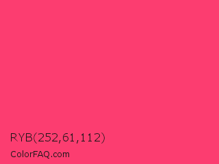 RYB 252,61,112 Color is a light rose color and the nearest color is Magic Potion #ff4466. Hex code #fc3d70 and RGB value is rgb(252,61,112). In RGB color space, this color is composed of 99% red, 24% green, 44% blue, In CMYK color space, this color is composed of 0% cyan, 76% magenta, 56% yellow , 1% black , In HSL color space, this color has a hue angle of 344° , 97% saturation and 61% lightness.