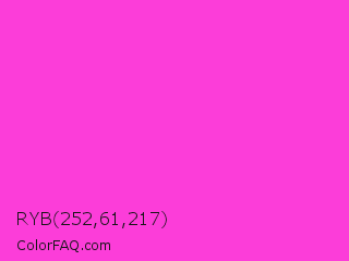 RYB 252,61,217 Color is a light magenta color and the nearest color is Razzle Dazzle Rose #ff33cc. Hex code #fc3dd9 and RGB value is rgb(252,61,217). In RGB color space, this color is composed of 99% red, 24% green, 85% blue, In CMYK color space, this color is composed of 0% cyan, 76% magenta, 14% yellow , 1% black , In HSL color space, this color has a hue angle of 311° , 97% saturation and 61% lightness.