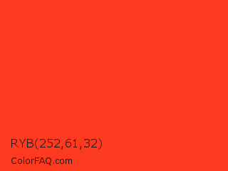 RYB 252,61,32 Color is a normal red color and the nearest color is Pomegranate #f34723. Hex code #fc3a20 and RGB value is rgb(252,58,32). In RGB color space, this color is composed of 99% red, 23% green, 13% blue, In CMYK color space, this color is composed of 0% cyan, 77% magenta, 87% yellow , 1% black , In HSL color space, this color has a hue angle of 7° , 97% saturation and 56% lightness.