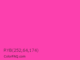 RYB 252,64,174 Color is a light magenta color and the nearest color is Wild Strawberry #ff43a4. Hex code #fc40ae and RGB value is rgb(252,64,174). In RGB color space, this color is composed of 99% red, 25% green, 68% blue, In CMYK color space, this color is composed of 0% cyan, 75% magenta, 31% yellow , 1% black , In HSL color space, this color has a hue angle of 325° , 97% saturation and 62% lightness.