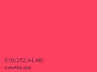 RYB 252,64,98 Color is a light red color and the nearest color is Neon Fuchsia #fe4164. Hex code #fc4062 and RGB value is rgb(252,64,98). In RGB color space, this color is composed of 99% red, 25% green, 38% blue, In CMYK color space, this color is composed of 0% cyan, 75% magenta, 61% yellow , 1% black , In HSL color space, this color has a hue angle of 349° , 97% saturation and 62% lightness.