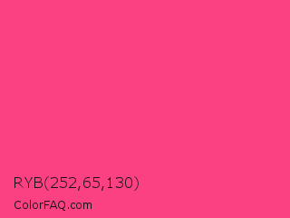 RYB 252,65,130 Color is a light rose color and the nearest color is Sasquatch Socks #ff4681. Hex code #fc4182 and RGB value is rgb(252,65,130). In RGB color space, this color is composed of 99% red, 25% green, 51% blue, In CMYK color space, this color is composed of 0% cyan, 74% magenta, 48% yellow , 1% black , In HSL color space, this color has a hue angle of 339° , 97% saturation and 62% lightness.