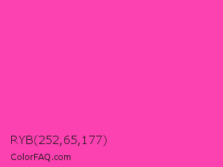 RYB 252,65,177 Color is a light magenta color and the nearest color is Wild Strawberry #ff43a4. Hex code #fc41b1 and RGB value is rgb(252,65,177). In RGB color space, this color is composed of 99% red, 25% green, 69% blue, In CMYK color space, this color is composed of 0% cyan, 74% magenta, 30% yellow , 1% black , In HSL color space, this color has a hue angle of 324° , 97% saturation and 62% lightness.