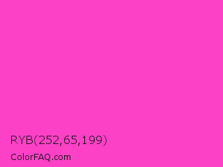 RYB 252,65,199 Color is a light magenta color and the nearest color is Razzle Dazzle Rose #ff33cc. Hex code #fc41c7 and RGB value is rgb(252,65,199). In RGB color space, this color is composed of 99% red, 25% green, 78% blue, In CMYK color space, this color is composed of 0% cyan, 74% magenta, 21% yellow , 1% black , In HSL color space, this color has a hue angle of 317° , 97% saturation and 62% lightness.