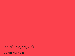 RYB 252,65,77 Color is a light red color and the nearest color is Sunburnt Cyclops #ff404c. Hex code #fc414d and RGB value is rgb(252,65,77). In RGB color space, this color is composed of 99% red, 25% green, 30% blue, In CMYK color space, this color is composed of 0% cyan, 74% magenta, 69% yellow , 1% black , In HSL color space, this color has a hue angle of 356° , 97% saturation and 62% lightness.