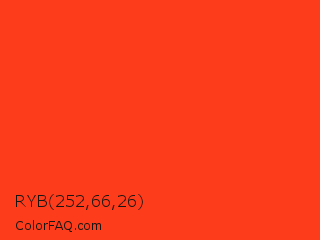 RYB 252,66,26 Color is a normal red color and the nearest color is Pomegranate #f34723. Hex code #fc3c1a and RGB value is rgb(252,60,26). In RGB color space, this color is composed of 99% red, 24% green, 10% blue, In CMYK color space, this color is composed of 0% cyan, 76% magenta, 90% yellow , 1% black , In HSL color space, this color has a hue angle of 9° , 97% saturation and 55% lightness.