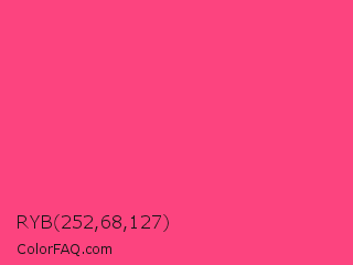 RYB 252,68,127 Color is a light rose color and the nearest color is Sasquatch Socks #ff4681. Hex code #fc447f and RGB value is rgb(252,68,127). In RGB color space, this color is composed of 99% red, 27% green, 50% blue, In CMYK color space, this color is composed of 0% cyan, 73% magenta, 50% yellow , 1% black , In HSL color space, this color has a hue angle of 341° , 97% saturation and 63% lightness.