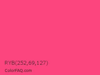 RYB 252,69,127 Color is a light rose color and the nearest color is Sasquatch Socks #ff4681. Hex code #fc457f and RGB value is rgb(252,69,127). In RGB color space, this color is composed of 99% red, 27% green, 50% blue, In CMYK color space, this color is composed of 0% cyan, 73% magenta, 50% yellow , 1% black , In HSL color space, this color has a hue angle of 341° , 97% saturation and 63% lightness.
