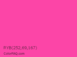 RYB 252,69,167 Color is a light rose color and the nearest color is Wild Strawberry #ff43a4. Hex code #fc45a7 and RGB value is rgb(252,69,167). In RGB color space, this color is composed of 99% red, 27% green, 65% blue, In CMYK color space, this color is composed of 0% cyan, 73% magenta, 34% yellow , 1% black , In HSL color space, this color has a hue angle of 328° , 97% saturation and 63% lightness.